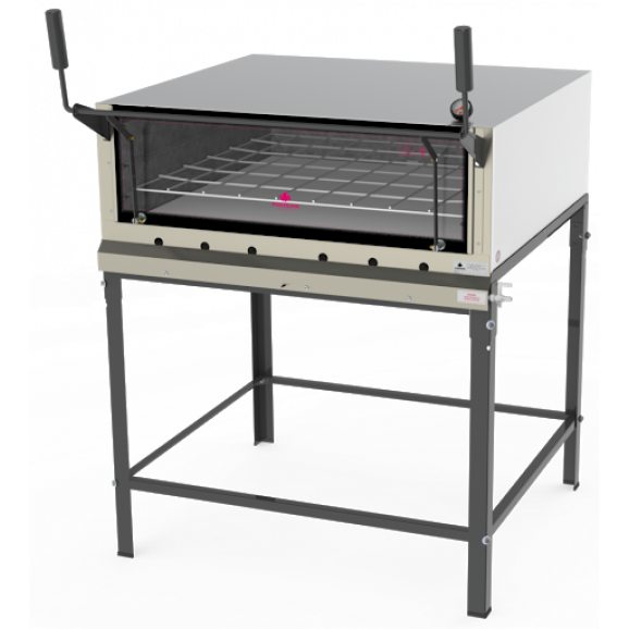 ESPECIFICAÇÕES: Cavalete desmontável, sapatas plásticas. Gaveta móvel, placas refratárias Termômetro para controle da temperatura Porta tipo guilhotina Visores de vidros temperados A gás baixa pressão 1 grade e suporte para dois níveis de altura.
